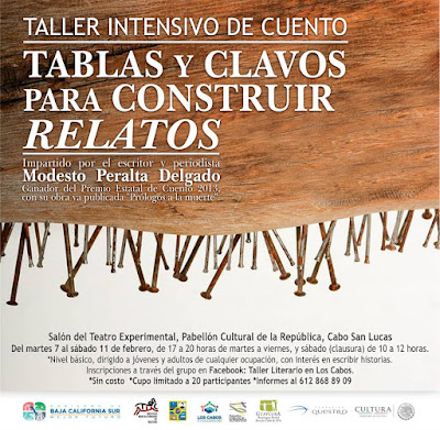 El Gobierno del Estado, la Secretaría de Cultura, el Instituto Sudcaliforniano de Cultura a través del H.II Ayuntamiento de los Cabos hacen una cordial invitación a Participar en los talleres “Tablas y clavos para construir relatos” impartido por el periodista y escritor Modesto Peralta Delgado y el Taller de teatro “Valentina y la sombra del diablo” impartido por Ricardo Gil Pinzón.