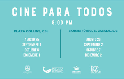 Derivado del proyecto “Cine en tu Colonia” el Festival de Cine de Los Cabos, con su nueva dirección, se suma y ofrece “Cine para Todos”. Cine para todos, es una propuesta de El Festival Internacional de Cine de Los Cabos en colaboración con el H. XII Ayuntamiento de Los Cabos y el Instituto de la Cultura y las Artes de Los Cabos, que ofrecerá, un Ciclo de cine al aire libre que se llevara a cabo en distintas plazas públicas de Los Cabos durante este año 2017, con 2 proyecciones al mes y con presencia de actores.