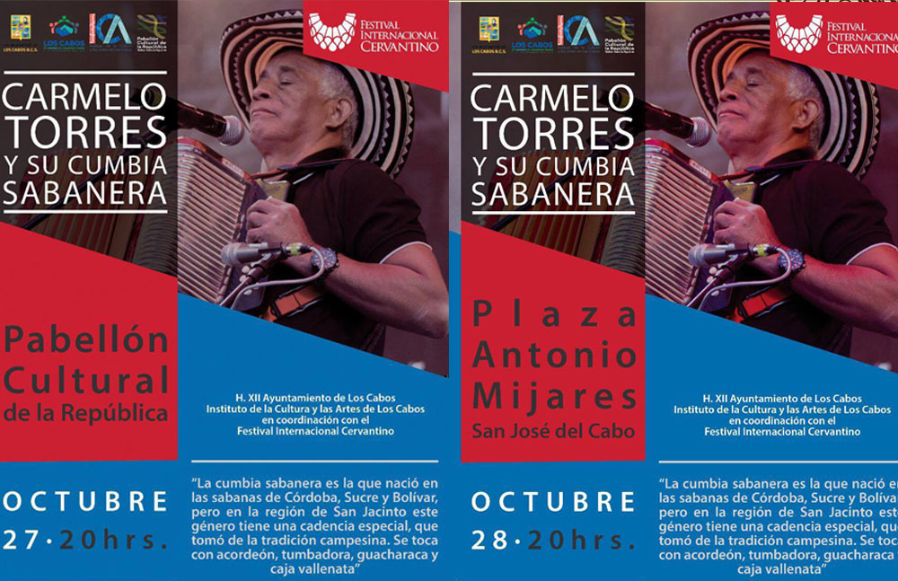 El pasado 27 y 28 de Octubre, se presentó, en un doble concierto, Carmelo Torres y su Cumbia Sabanera, en el Pabellón Cultural de la Republica en Cabo San Lucas, y en la Plaza Mijares en San José del Cabo, Carmelo Torres, uno de los más grandes exponentes de la cumbia sabanera en Colombia, esto, como parte de la extensión del programa oficial del Festival Internacional Cervantino (FIC), que se realiza todos los años en el estado de Guanajuato, para ofrecer espectáculos de primer nivel.