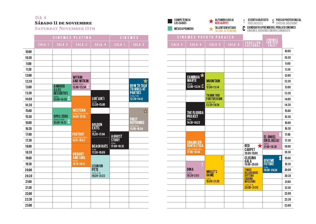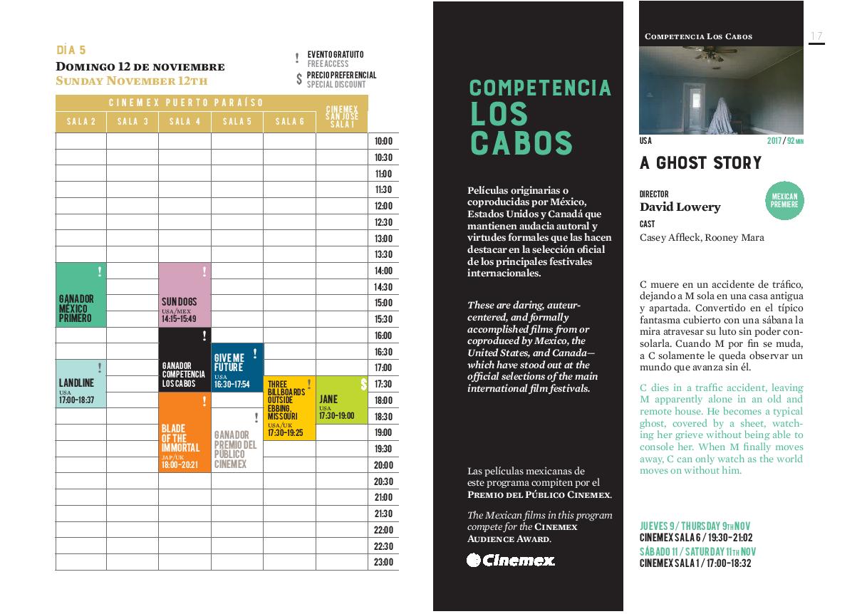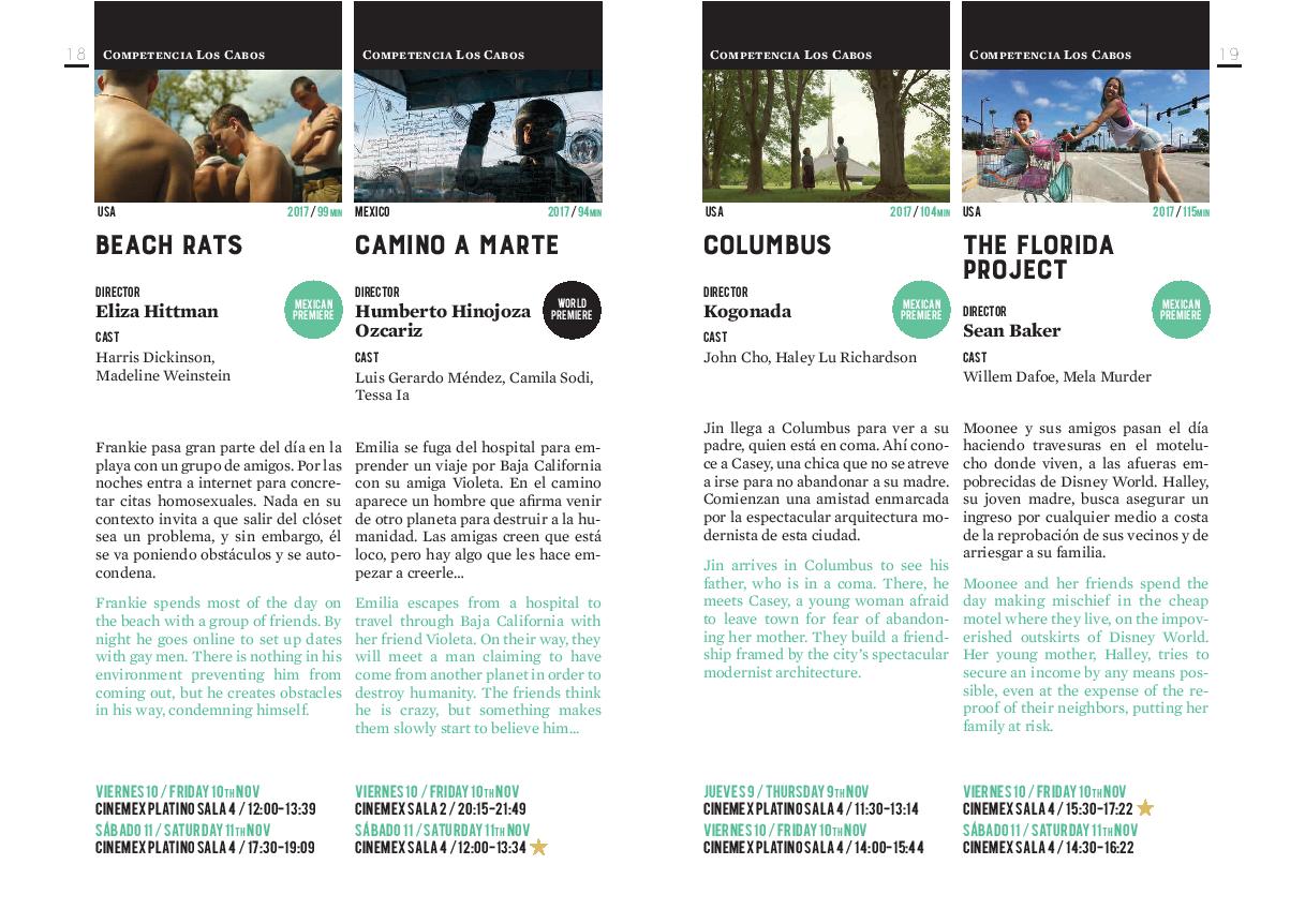 La programación del Festival Internacional de Cine de Los Cabos, contará con alrededor de 40 películas de reciente producción, con 20 estrenos para México, 8 estrenos para Latinoamérica, 5 estrenos mundiales y 3 estrenos internacionales. Todo dentro de sus diferentes secciones como son, COMPETENCIA LOS CABOS, MÉXICO PRIMERO, GALAS, WORLD HIGHLIGHTS, AMERICAN SPECIALS, TRIBUTE, SPECIAL PRESENTATIONS, B-SIDE, GREEN.